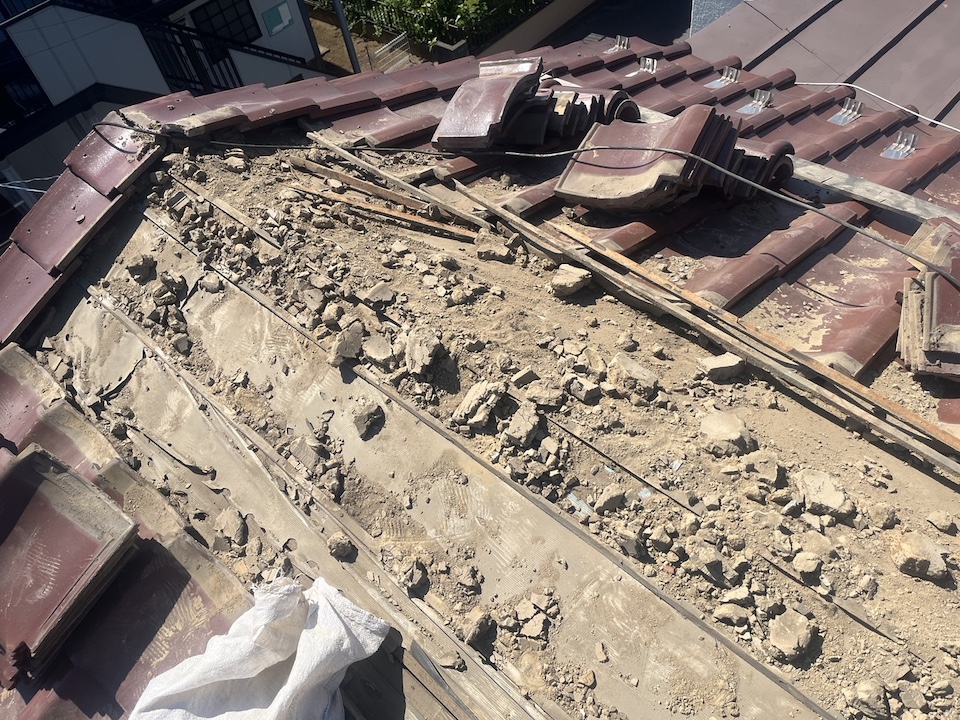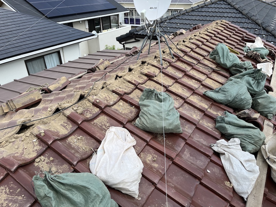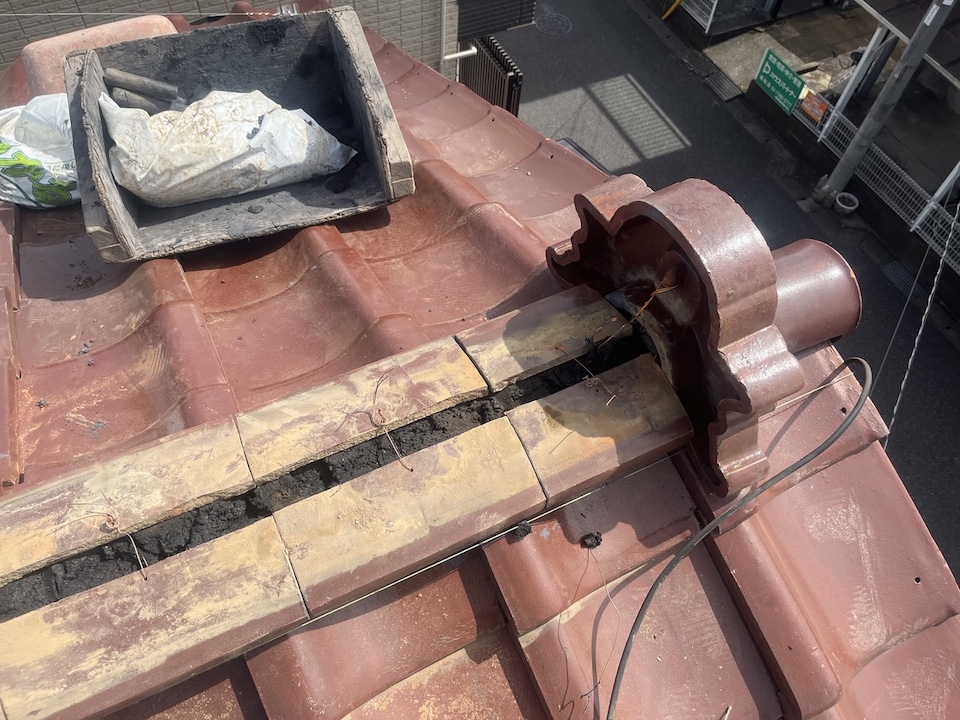 地震や劣化でズレが起きていた棟瓦を、崩れないように積み直し!