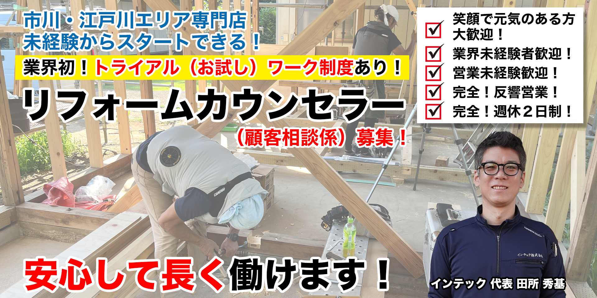 そんなあなたと出会えることを、心から楽しみにしています。 共に、リフォーム業界に新しい風を起こしていきましょう。