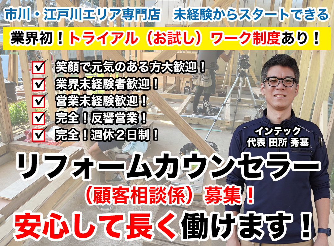 当社では現在、事業拡大のため、また、これまでにない新しいリフォーム会社を作っていくために、住宅リフォームのカウンセラーを募集しています。
